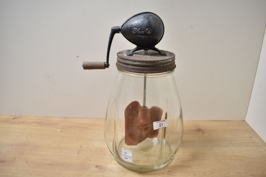 A large early 20th-century British glass and metal Blow butter Churn, marked to handle and base, approximately 36cm tall, condition is consistent with age and use, visible metal tarnish and wear to top section, no visible cracks, chips or fixed damage.
