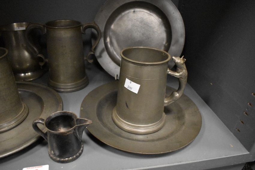 A large quantity of 18th, 19th and early 20th-century pewter ware, to include a large Georgian charger, stamped to the reverse ‘John Home’, ‘London Superfine’ and dated 1776; a selection of three further Georgian plates; a ‘Hard’ example, all with numerous impressed marks to reverse; a pair of pewter tankards featuring fox handles; a glass-bottom tankard featuring the slogan ‘The One That Got Away’; a rowing trophy tankard, dated 1903, featuring scrolled twin handles, the names of the winning crew members and a lion crest, and more, some but not all marked, (approximately 11 pieces), condition is consistent with age and use, visible pewter ware to all chargers/plates, visible scratches and dust to most pieces consistent with storage.