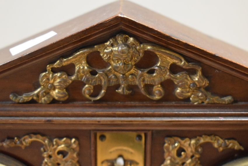 A late 19th to early 20th-century French-style oak and gilt-metal mounted desk clock and barometer set, of an architectural form with scrolled gilt detailing, unmarked, 38cm, condition is consistent with age and use, visible wear to gilt with metal discolouration, no keys.