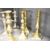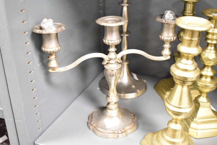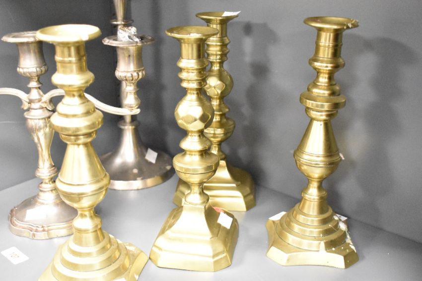 A quantity of 19th to 20th-century metal candlesticks, to include a pair of 'beehive' polished brass examples, featuring a turned baluster shape and an internal 'push-up' mechanism that helps to remove spent candle stubs; a pair of 'queen of diamonds' polished brass exmaples, featuring a central multi-faceted stem design; one silver-plated three-arm candelabra and one modern metal five-arm candelabra with rotating arms, all unmarked apart from the candelabras, (6), condition is consistent with age and use, visible wax residue to all.