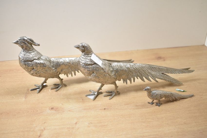 A group of three 20th century silver plated Pheasants studies, largest measures 26cm long, condition consistent with age and use.