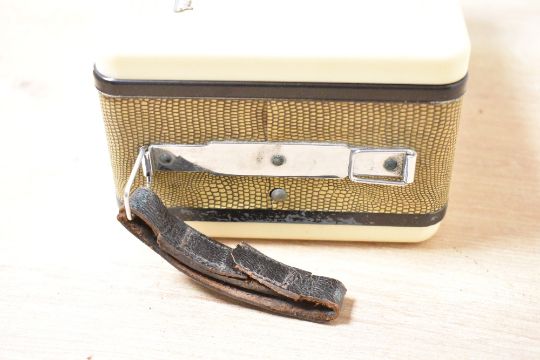 A mid 20th-century Italian G. Marconi Marconiphone P20B ‘vanity-style’ portable valve radio, operating on both medium- and long-wave frequencies; originally the radio would have automatically switched on when the lid was raised, marked to the interior, measuring approximately 12 cm x 17 cm, condition is consistent with age and use, with visible wear to the exterior metal; the original leather handle is intact, though detached on one side. Sold as seen.