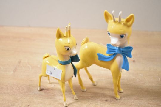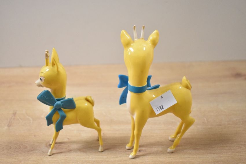 Two vintage Babycham plastic deer advertisement figurines, unmarked, tallest 15cm and smallest is 13.5cm, condition is consistent with age and use, no visible damage.
