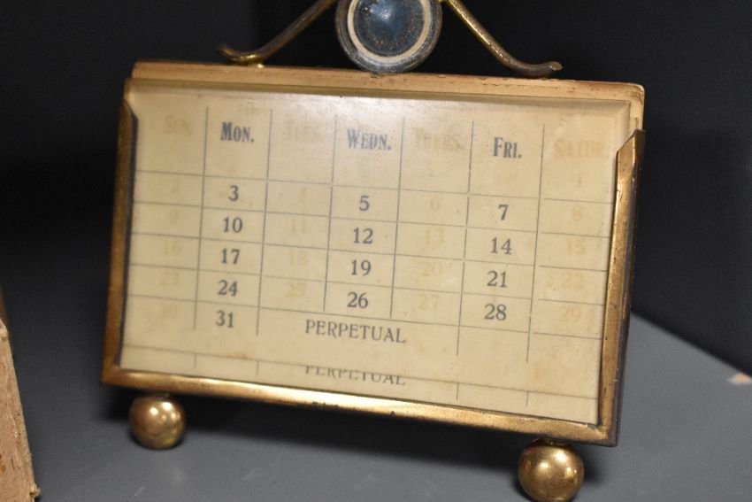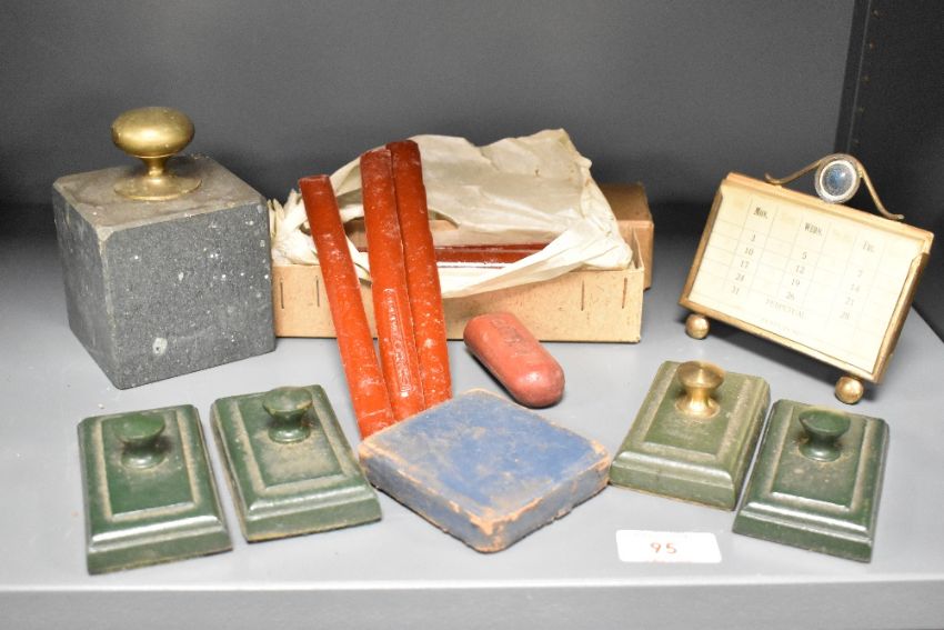 A quantity of late 19th-century desk accessories, to include a small brass perpetual desk calendar; a box of red Bank of England–style sealing wax; and a selection of brass and metal paperweights and ink blotters; comprising eight pieces and one box of sealing wax; condition consistent with age and use, with visible metal wear to the desk calendar, the wax very brittle, and surface wear evident throughout.