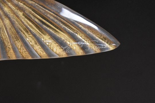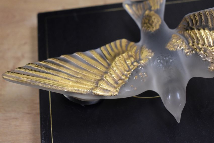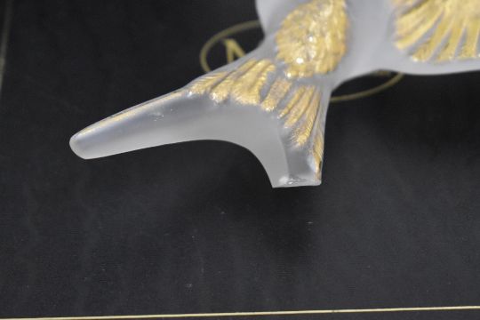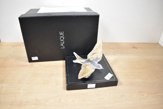 A 20th-century French Lalique Crystal Hirondelles Swallow Wall Ornament, featuring gold-stamped crystal delicately rendered plumage, , marked to underside tip of wing, having reverse wall magnet to mimic a bird in flight, H8.8cm x W.15.3cm x D.16.6cm, 0.45kg, condition is consistent with age and use, tip of back right tail wing is damaged, please refer to photos, in need of repair. Original box is included. The Hirondelles collection was produced to celebrate Lalique’s 130th anniversary, with the swallow described as an emblematic symbol of freedom and happiness.