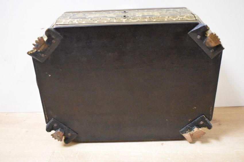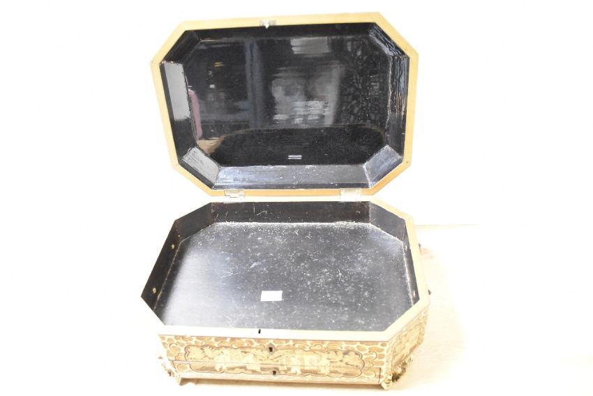 A 19th-century Chinese export black and gilt lacquer work box, of elongated octagonal form, featuring detailed scenes of figures in courtyards, gardens or pagodas, with floral and foliate decoration throughout, having twin metal handles and raised upon four hand-carved feet, approximately 16cm tall, 36cm in length and 25cm in width, condition is consistent with age and use, with visible areas of surface wear to the decoration and gilt, most visible to the top of the hinged lid, small chips present, one most visible to the front left side adjacent to the keyhole, the box sits slightly uneven due to degradation to one of the feet and no key is present.