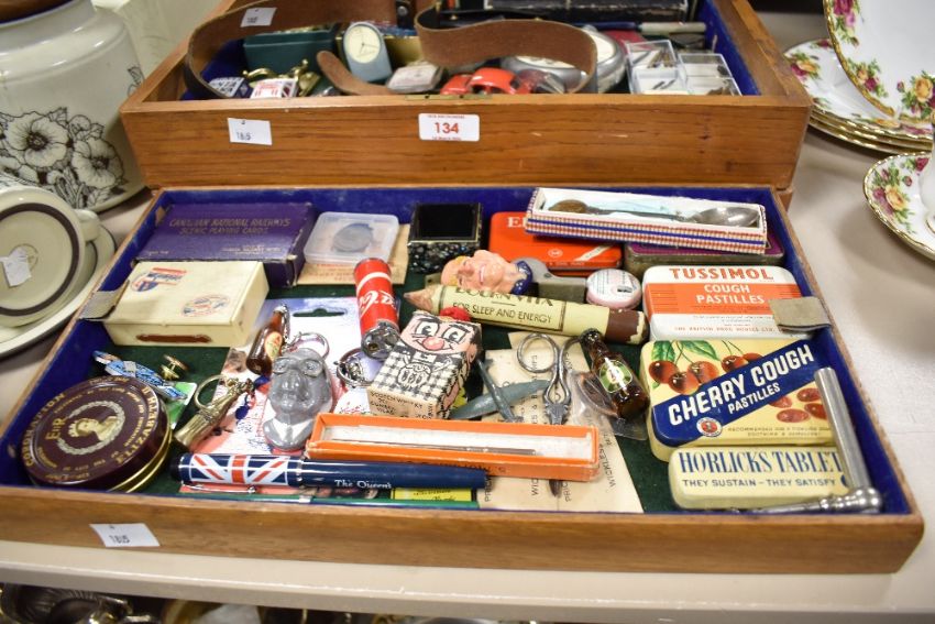 A miscellaneous selection of vintage items to include various key-rings, novelty Coca-Cola lighter, two Hohner miniature harmonicas, multiple couch sweet tins and two Robert Opie collection fridge magnets etc.