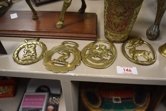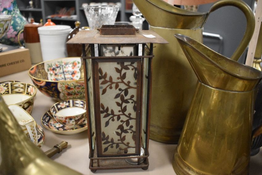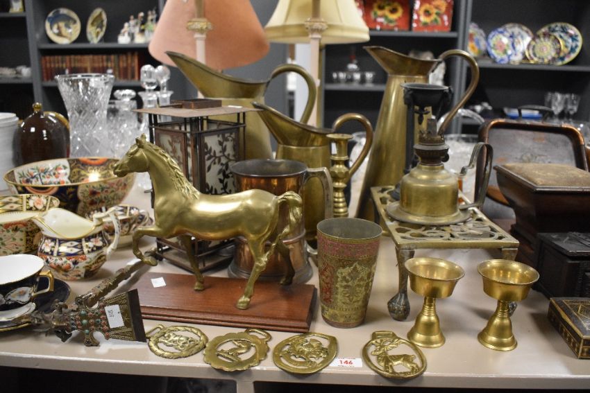 A large selection of 20th century brass and metal ware to include an east Asian jewelled ceremonial adze featuring a deer head motif to top measuring 29cm long, three jugs and a large tankard, condition consistent with age and use.