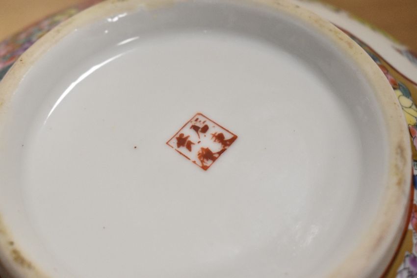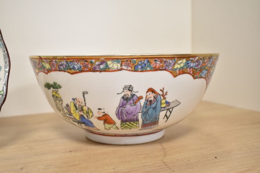 Thought to be a 20th-century Chinese Famille Rose porcelain bowl, featuring a hand-painted figural central scene, surrounded by an elaborately coloured and gilt floral border with similar decoration to the exterior, marked to base; sold with an early 20th-century Royal Doulton decorative plate, featuring an Oriental-inspired Birds of Paradise motif and a crimson-red rim, also marked to base, (comprising 2 items), condition consistent with age and use, with no visible cracks, chips or fixed damage to either.