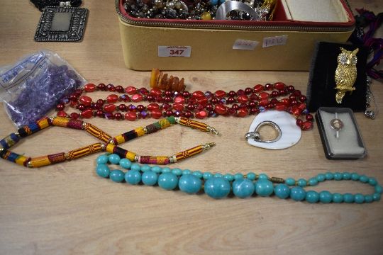 A vintage cream jewellery box, containing an assortment of costume jewellery including amethyst chips, a rough cut amber pendant, a gold plated gate bracelet, beaded jewellery and statement pieces