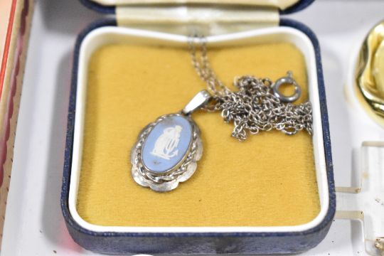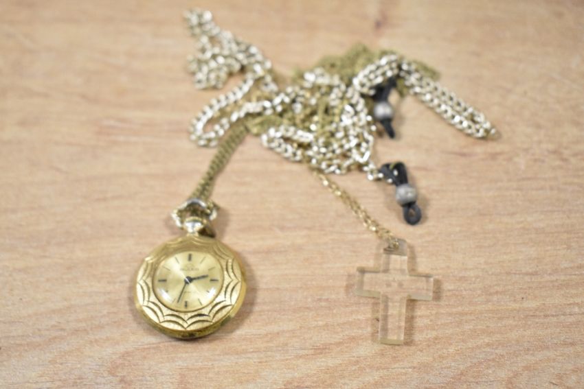 A small assortment of costume jewellery, including a large statement chain, a shield medallion and pocket watch