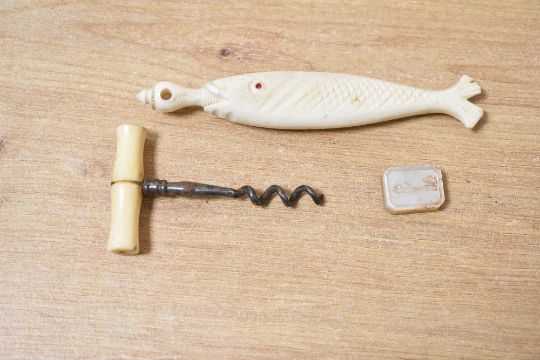 A 19th-century hand carved ox bone fish-formed needle case; sold with a miniature bone handled corkscrew and a mother-of-pearl intaglio stamp, (3), condition is consistent with age and use, stanhope now missing from needle case.
