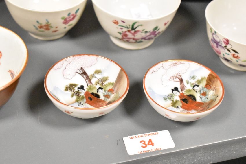 A quantity of late 18th to early 20th-century Chinese porcelain, comprising a presumed 18th-century underglaze blue and iron-red floral, foliate, and scroll-motif export plate; a 20th-century plate featuring a central phoenix-style waterfowl amongst bamboo and flowers, with a shell-like, organic scrolled rim; a small underglaze blue and iron-red floral tea bowl; and three presumed 18th/19th-century famille rose-palette tea bowls, all unmarked, (8 pieces), condition is consistent with age and use, some areas of visible wear to all, no fixed damage, large paint chip to one dish and small chips to rim of one of the tea bowls.