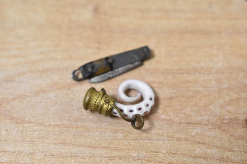 A quantity of 19th-century miniatures, to include a pair of gilt stork-shaped embroidery scissors with an ivorine pocket knife; a German 'bergy Cutlery Company' tortoiseshell handled pocket knife and an even smaller example; a gilt and porcelain organically-formed tentacle shaped scent bottle, 2cm; and a banded agate seal bearing the profile of a man upon a keychain larger penknife is marked to blade but no other marks present, (5 pieces), condition is consistent with age and use, visible surface wear to all, smallest pocket knife has a chip to section of tortoiseshell handle on one side, scent bottle handle is slightly loose to one side and does not retain original stopper.