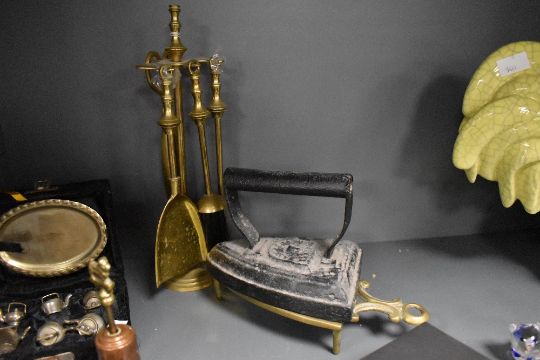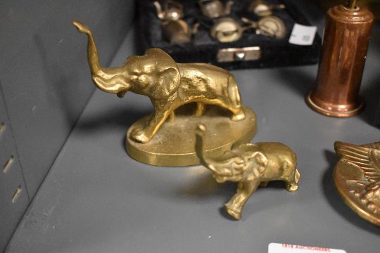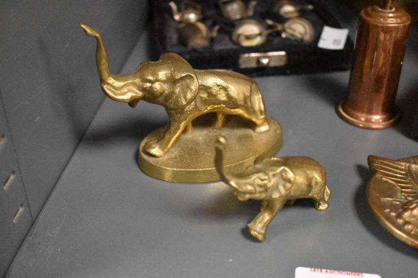 A selection of late 19th to early 20th-century metal sundryware, to include a Hubley Sealyham Terrier brass and copper table brush having a 'sealyham' dog finnial; two brass elephant figurines; a brass eagle belt buckle; a brass table-top fireplace companion set upon a stand; a boxed miniature dolls house tea-set and more, most unmarked, (approximately 9 pieces), condition is consistent with age and use.