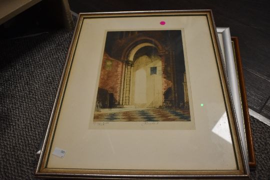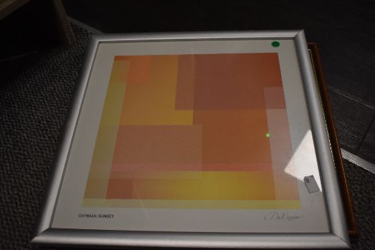 After Francis Blackburn (contemporary) a limited edition print 'water' abstract, signed, entitled and numbered 11/150 in pencil to margin, within a card mount and moulded frame, under glass 22cm x 27cm & 40cm x 44cm sold along with a colour print, geometric abstract 'Outback Sunset' Facsimile signature DaDeppo and a Rembrant Guild artists proof colour etching church interior scene.