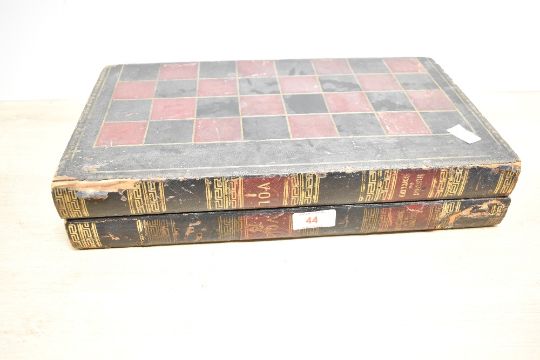 A late 19th-century wooden backgammon and chess set, of folding book form; sold with two purple leather dice cups, boxed wooden checkers with dice, and 'The New Backgammon' book by Elizabeth Clark Boyden (comprising 1 board, 2 dice shakers, 1 box of checkers with dice, and 1 book), condition is consistent with age and use, with visible degradation to the exterior of the board, while the interior is in noticeably better condition; the dice shakers show clear signs of use; the checkers and dice appear lightly used; and the book has a torn cover. All items show use to varying degrees.