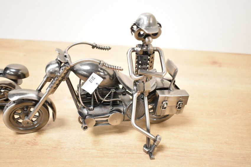 Two contemporary scarp metal sculptures, to include two motorbikes, unmarked, (2), condition is consistent with age and use.