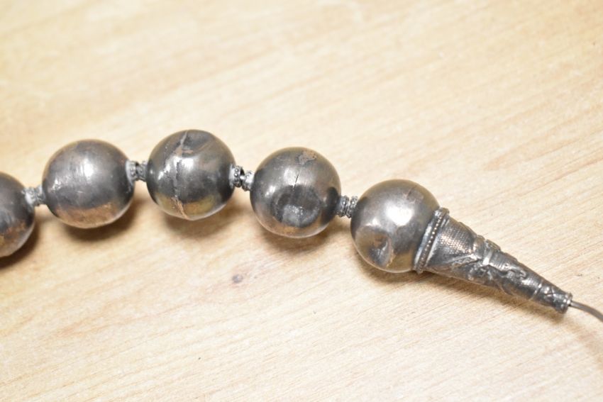 A late 19th to early 20th-century Omani white metal ball necklace, featuring hollow decorative orbs on a thin wire chain, with embossed khanjars to the outermost beads in a shield-like formation, having a scrollwork hand-formed hook clasp, unmarked, 64 grams, condition consistent with age and wear, with visible surface tarnish, dents to the orbs and a couple of small scratches.