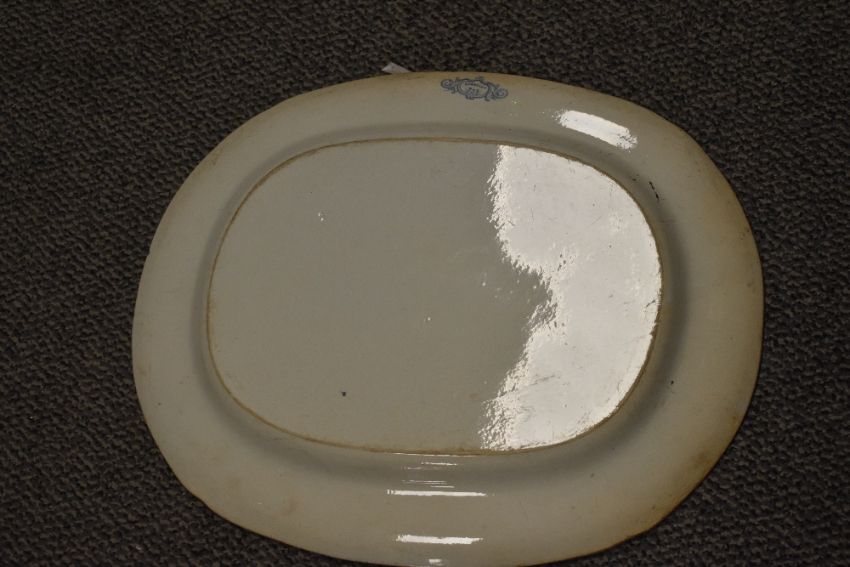 A Victorian blue and white transfer printed ironstone meat plate or ashette, of rounded and dished rectangular form decorated with a classical garden scene within repeating borders 49cm x 40cm