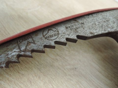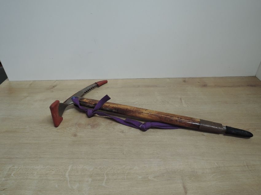 Italian Chouinard Zero Ice Axe, wooden shafted with leather sheaths present, length 53cm