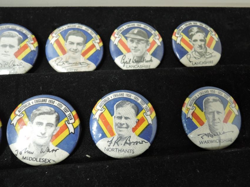 Argus & Australasian Post, Cricket Badges, Australia v England 1950-1951 Test tour, English players. Bailey, Brown, Close, Simpson, Hutton, Sheppard, Washbrook, Compton, Evans, McIntyre, Warr, Hollies, Berry, Dewes, Bedser & mascot, Australian Player. Hassett & Mascot, 32mm diameter each, 18 in total