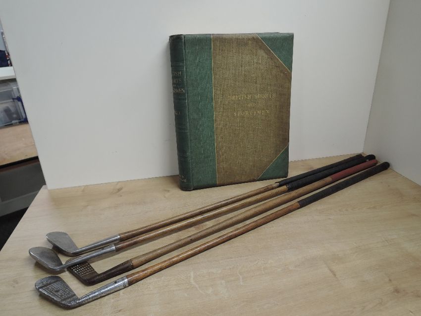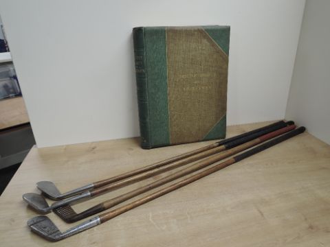 Vintage Hickory Shafted Golf Clubs and Sporting Volume, Ernest Whitcombe 1890-1971 endorsed 6 Mashie Niblick, along with 7 Mashie, The Unbreakable Putter and Spalding 3 Iron, British Sports and Sportsmen Past & Present Vol II, all inn used condition