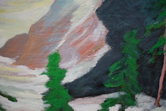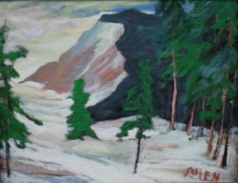Allen (20th Century) Impressionistic oil on re-used canvas, the original painting depicts a collection of female life studies with the later being a mountainous winter landscape, signed lower right, within moulded frame 74cm x 57.5cm & 86cm x 69cm overall.