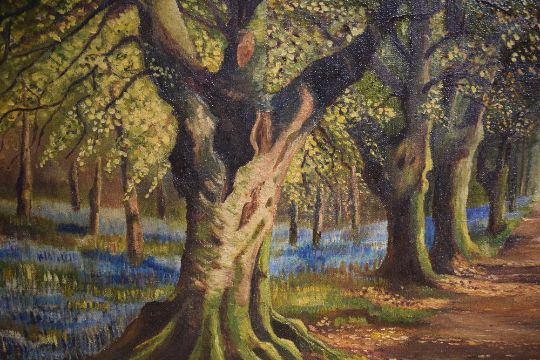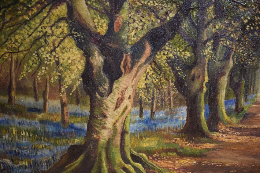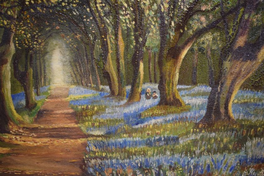 20th Century oil on canvas, a woodland landscape with figures among bluebells, unsigned or attributed, within moulded gilt frame, 75.5cm x 40cm & 81cm x 44.5cm overall.