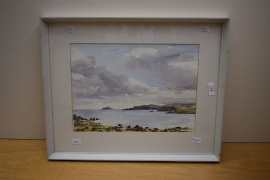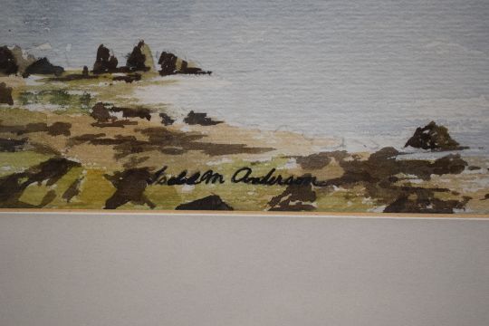 *Local Interest* Isabel McNair Anderson (British 1904 -1979) Watercolour 'Seascape, Galloway', signed lower right, entitled and attributed verso with artist biography, within card mount and moulded frame, under glass 36cm x 25cm & 50cm x 41cm overall. Sold alongside two other watercolours by the same artist 'Autumn Beech Leaves' and 'Geranium'.