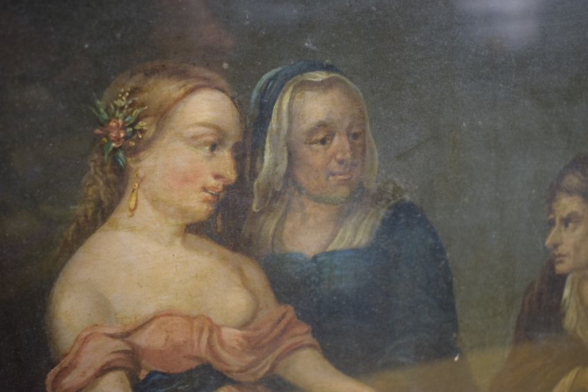 An 18th/19th Century oil on canvas, depicting a partially exposed young woman being presented to a debt collector with the devil in the shadows, in a Baroque pallette, unsigned or attributed, within moulded gilt frame, under glass 42cm x 32cm & 73cm x 62cm overall.