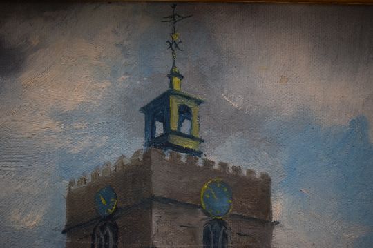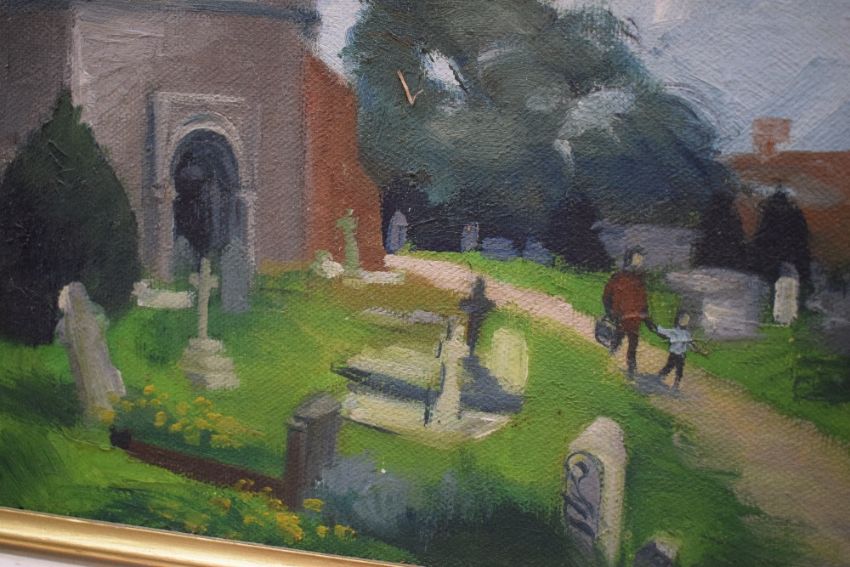 Olga Lehmann (Chilean 1912 - 2001) Oil on board 'Finchingfield Church' a study of the small Essex village church from it's yard, signed lower left, entitled and dated (1975) verso, 39cm x 29cm & 44cm x 34cm overall.