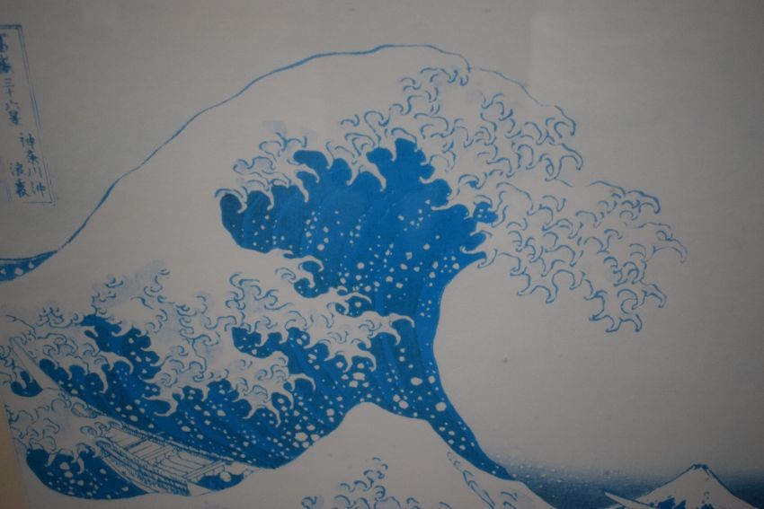 After Katsushika Hokusai (Japanese 1760 - 1849) Lithograph 'The Great Wave off Kanagawa', within card mount and flat frame, under glass 65cm x 46cm & 93.5cm x 73cm overall.