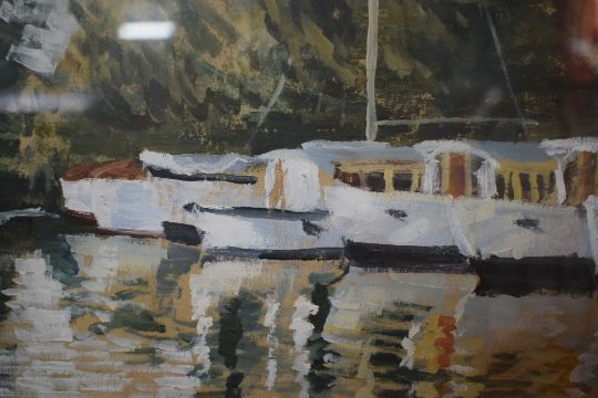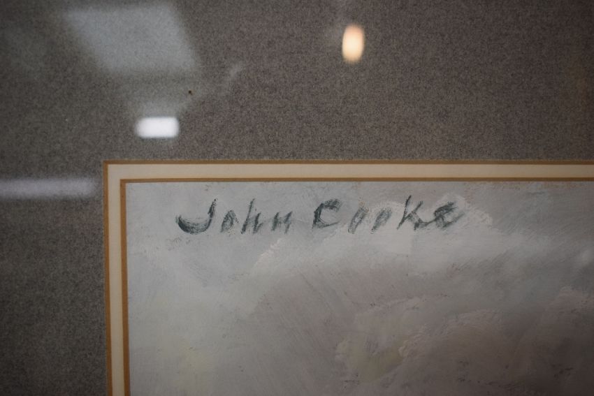 *Local Interest* John Cooke (British 1929 - 2018) Oil on board 'Womack Water - Near Broads' a view with iconic boats of the Norfolk Broads, signed upper left, entitled with attribution verso, within stepped card mount and moulded gilt frame, under glass 52cm x 36cm & 74.5cm x 57.5cm overall.