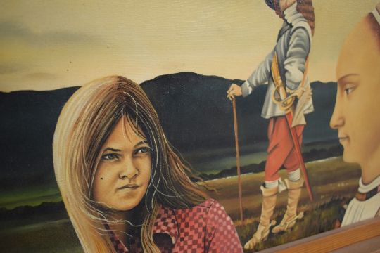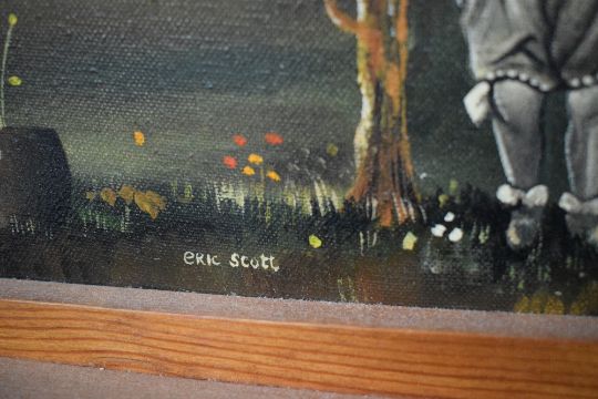 Eric Scott (British 1945 - 2005) Surrealist oil on canvas 'Question', depicting figures from different time periods against a stormy moorland landscape, signed lower left, attributed and entitled verso, within flat wooden frame, 91.5cm x 88.5cm & 103 x 100.5cm overall.