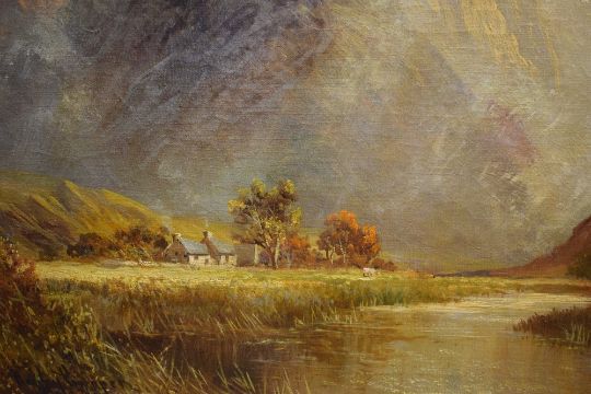 Henry Cooper (British 19th Century) Oil on canvas, a highland river scene with cottages, signed lower left, within moulded black frame, 60cm x 39.5cm & 67cm x 46.5cm overall.