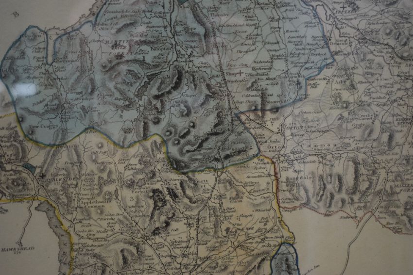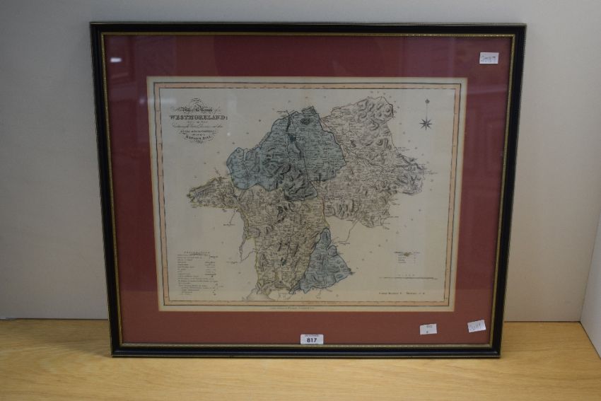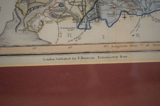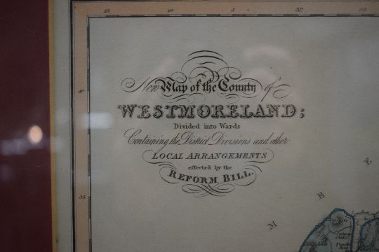 After J.Duncan (19th Century) Colourised map 'New Map of the County of Westmorland divided into wards, containing the district divisions and other local arrangements effected by the reform bill', publishing details to lower margin read 'London, Published by J.Duncan Paternoster Row', vendor details verso state 'Probably by William Ebden, Engraved by Hoare and Reeves?', within pink card mount and moulded frame, under glass 45.5cm x 36cm & 61cm x 51cm overall.