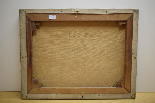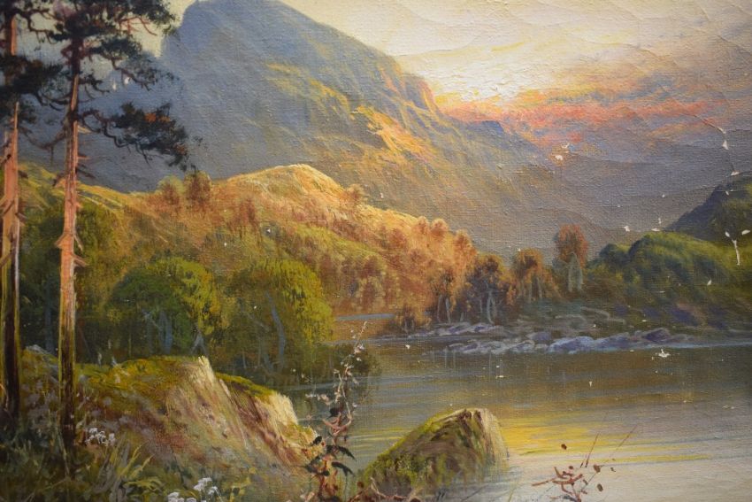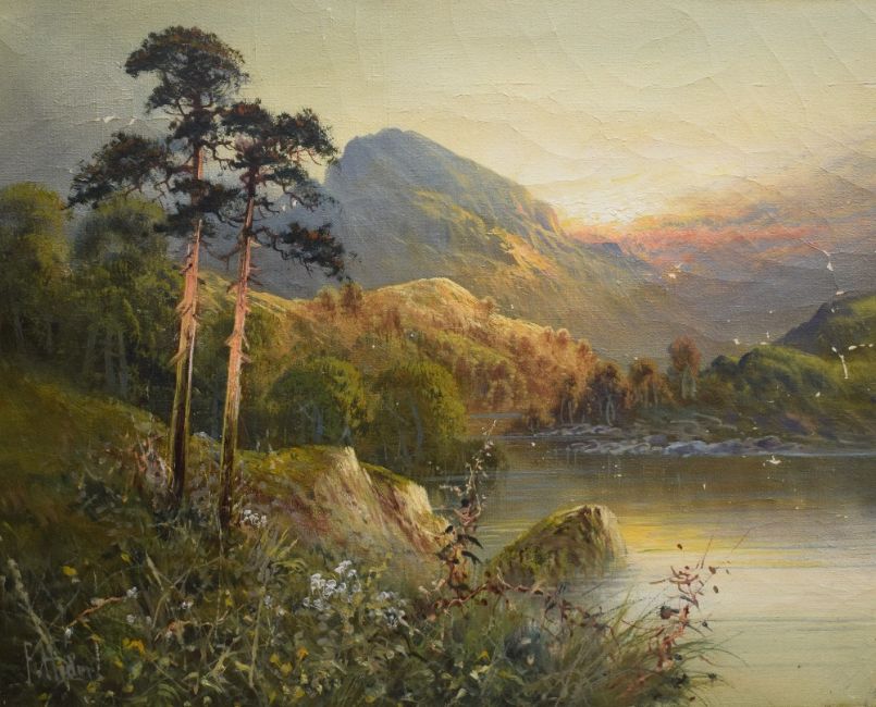 Frank Hider (British 1861 - 1933) Oil on canvas 'Summer in the Highlands', sunset over a mountainous river scene, signed lower left, entitled verso, 46cm x 36cm overall. Some cracking to paint.