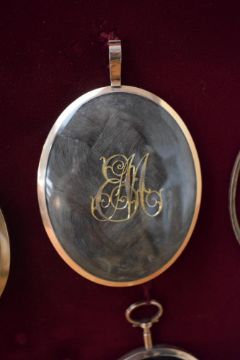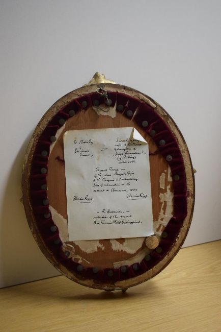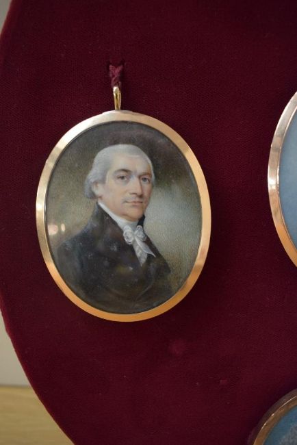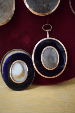 A collection of 4 portrait miniatures with locks of hair verso, each a gentleman in period attire, a fifth miniature is missing from the collection, attached to a red velvet backboard and within a moulded gilt frame, under glass each measuring on average 6.5cm x 7.5cm and 30cm x 37cm overall. *Those featured are named verso as 'Edward Moore', 'Fletcher Rigge' and '... Harrison' also listed is 'Sarah Gray wife of Edward Moore' possibly representing the missing portrait.