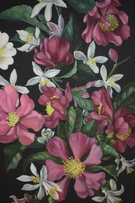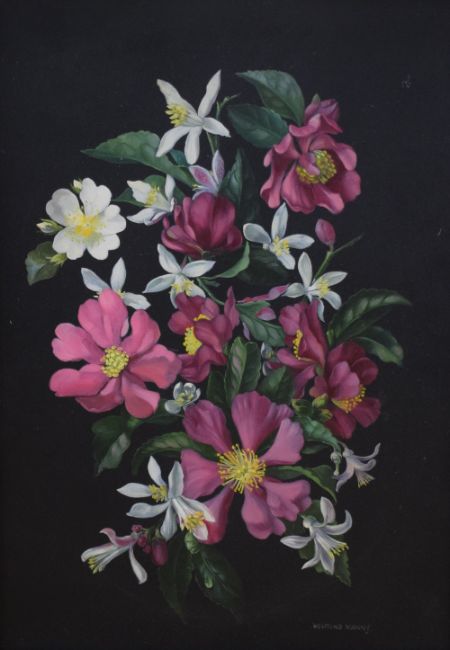 Desmond Kenny (Irish b.1956) Oil on board, a floral still life study, wild roses and citrus blossoms in shades of pink and white on a dark background, signed lower right, within moulded frame, 24cm x 34.5cm & 29cm x 39.5cm overall.