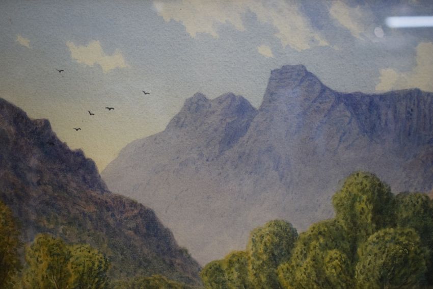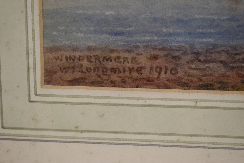 *Local Interest* William Taylor Longmire (British 1841 - 1914) Watercolour 'Langdale Pikes', the iconic Lake District peaks as seen from Great Langdale Beck, signed entitled and dated (1903) lower right, within gilt mount and moulded frame, under glass 34.5cm x 24.5cm & 57cm x 46cm overall. Sold alongside a second smaller watercolour by the same artist 'Windermere from near Low Wood', signed entitled and dated (1910) lower left and entitled verso.