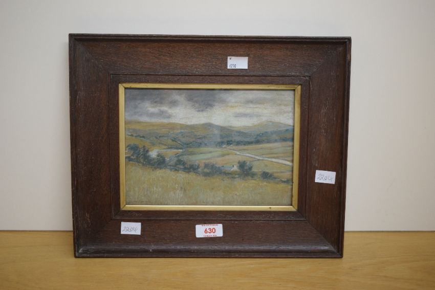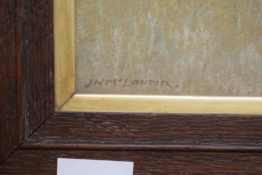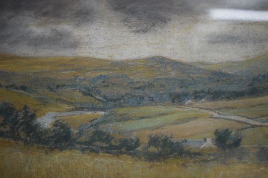 James Napier McLaurin (British 1869 - 1938) Oil Pastel, a rural landscape with rolling hills, signed in pencil lower left, within moulded wooden frame, under glass 22cm x 15.5cm & 35.5cm x 29cm overall.