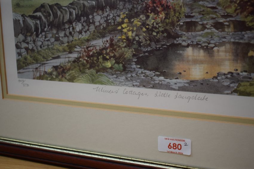*Local Interest* After Judy Boyes (British b.1943) A pair of Lithographs 'Lakeland Bed and Breakfast' and 'Miner's Cottages, Little Langdale', quintessential Lake District cottage scenes, both signed and entitled in pencil to mounts, the first numbered (35/850) and the second (408/850), within stepped card mounts and moulded wooden frames, under glass 41cm x 28cm & 56cm x 43cm overall.