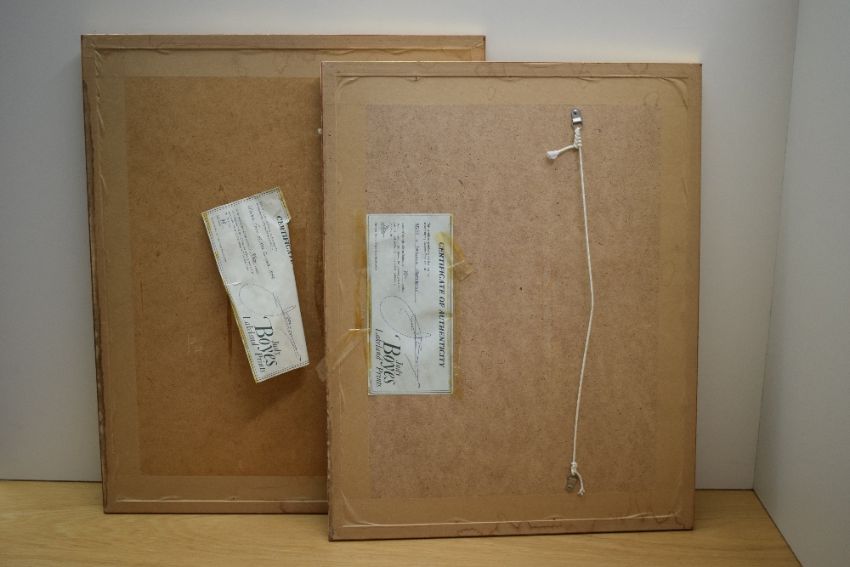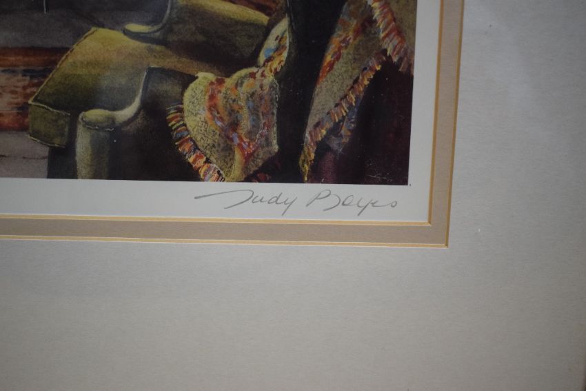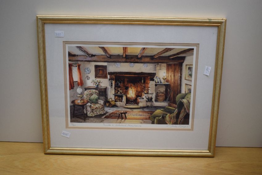*Local Interest* After Judy Boyes (British b.1943) A pair of Lithographs 'Inside a Lakeland Farmhouse' and 'Opening Time at The Queen's Head Troutbeck', two fireside scenes, both signed and entitled in pencil to mounts, the first numbered (762/850) and the second (148/850), certificates of authenticity verso, within stepped card mounts and moulded gilt frames, under glass 41cm x 28cm & 58cm x 47cm overall.