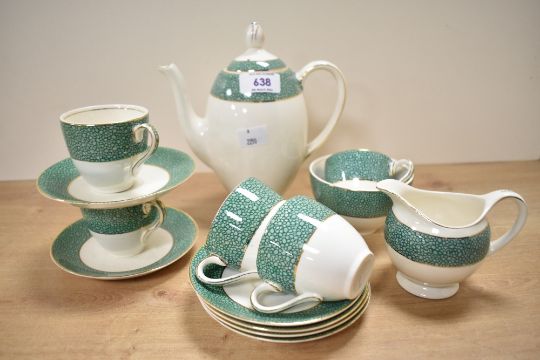 A 20th-century J&G Meakin pottery 'Florida Sol' tea set, featuring rich green speckled decoration and gilded detailing, to include cups, saucers, teapot, milk jug and sugar bowl, all marked to base, (13 pieces), condition is consistent with age and use.