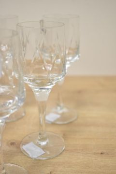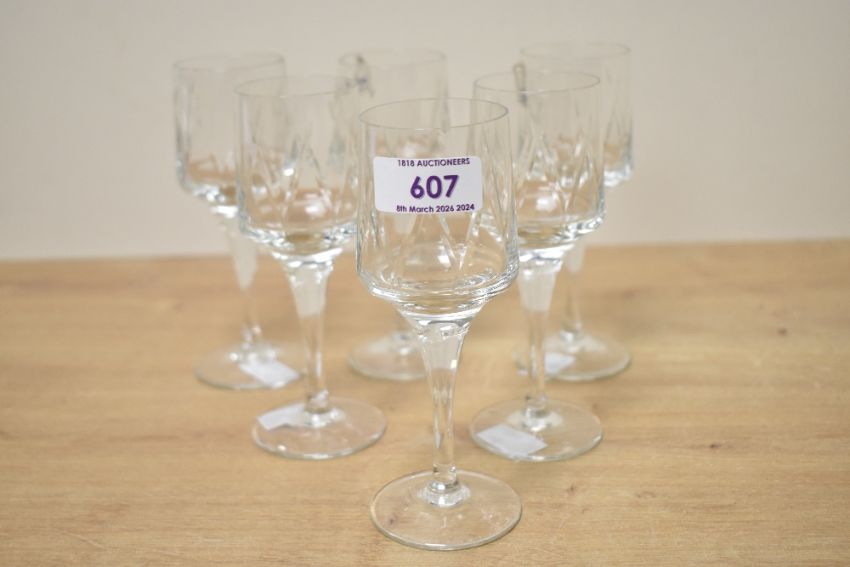 A set of six 20th-century Metropolitan Crystal Glassworks (MCG) liqueur glasses, featuring decorative angular cuts on the bowl, a slender stem, and a rounded base, unmarked, (6).