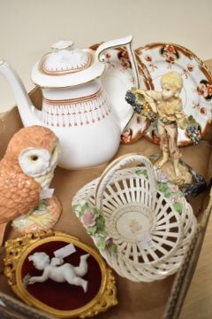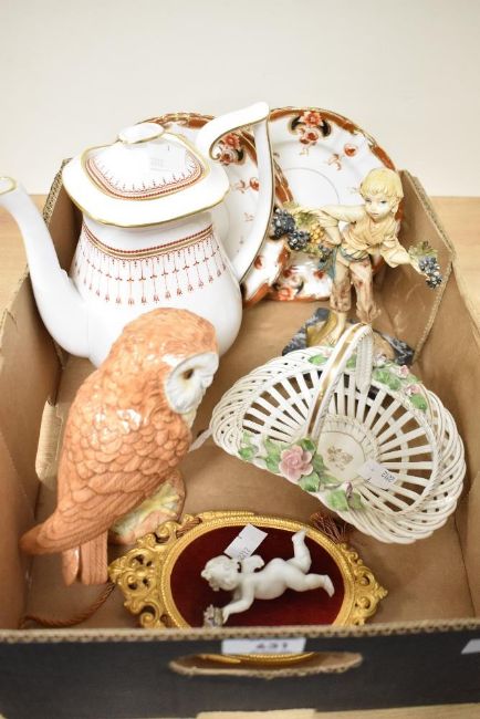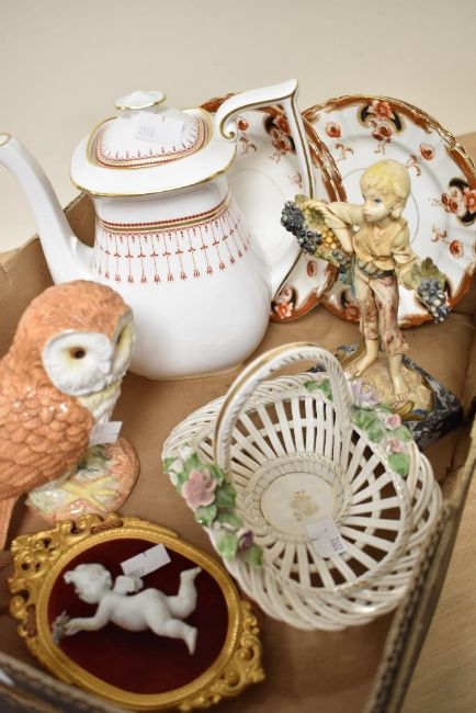 A Spode 'Kengsington' coffee pot, a Country Life by Leornardo Owl study, a vintage Fontanini Simonelli boy figure and reeticulated ceramic basket etc.