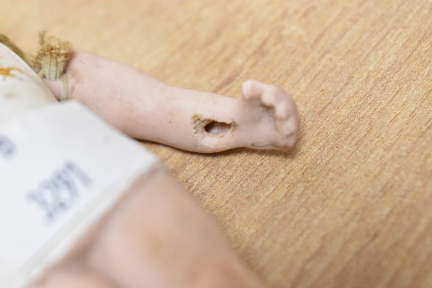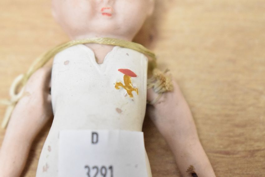 An early 20th-century hand-painted bisque jointed doll, featuring delicately painted facial features with faint rosy cheeks and fine detailing to lips and eyes, wearing a pacifer and having jointed arms allowing for basic movement, 13cm in height, light surface wear and minor scuffing consistent with age and handling.