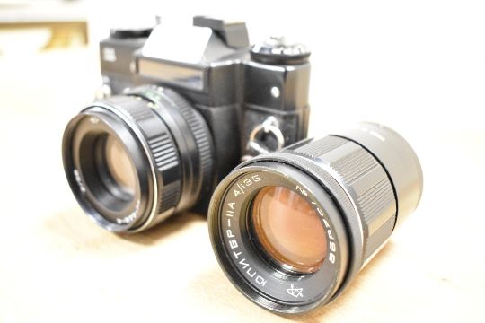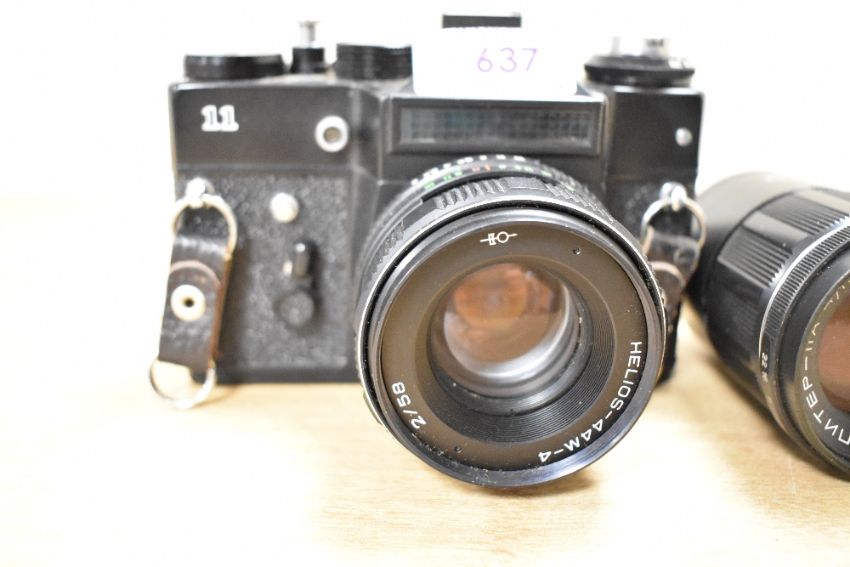 A Zenit 11 35mm SLR camera with a Helios 44 58mm f2 lens. Sold alongside a Soviet Jupiter-IIA 4/135 135mm f4 lens, camera bag and Helios 220 flash unit.
