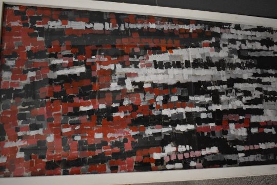 Artist unknown a bold contemporary abstract acrylic on paper, made up of squares in tones of red black and white, obscured signature and date 'atto..20...' lower right, within flat white frame, under glass 73.5cm x 145cm & 82cm x 155cm overall.
